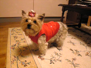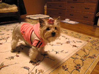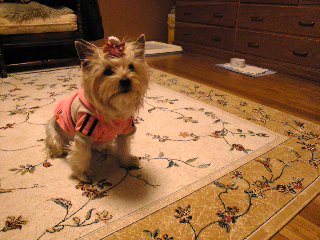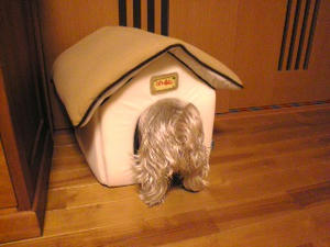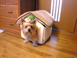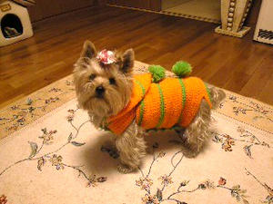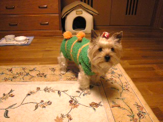 ニットの縞模様でフードがついているオレンジとグリーンの色違いは、私のお手製です。